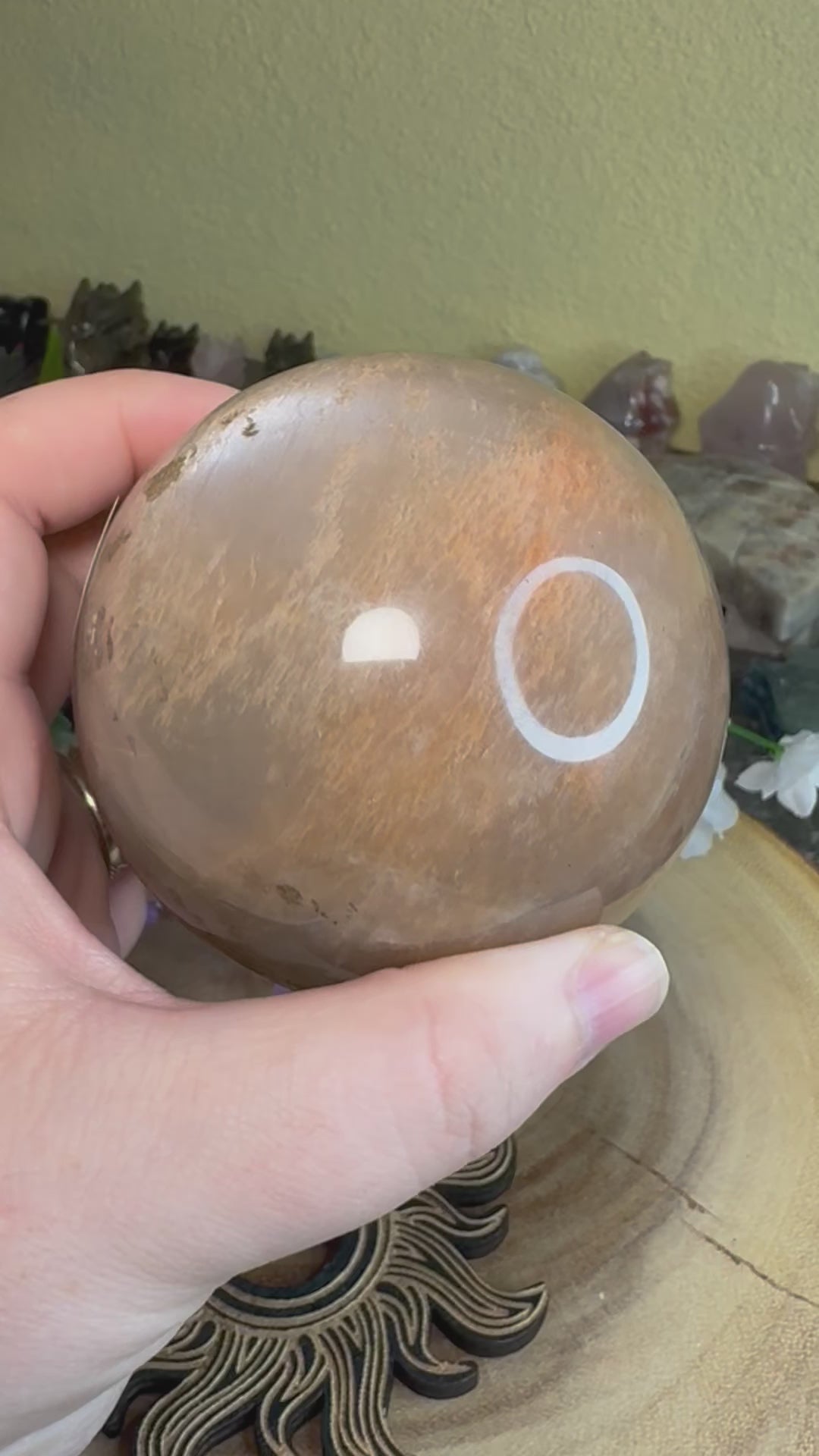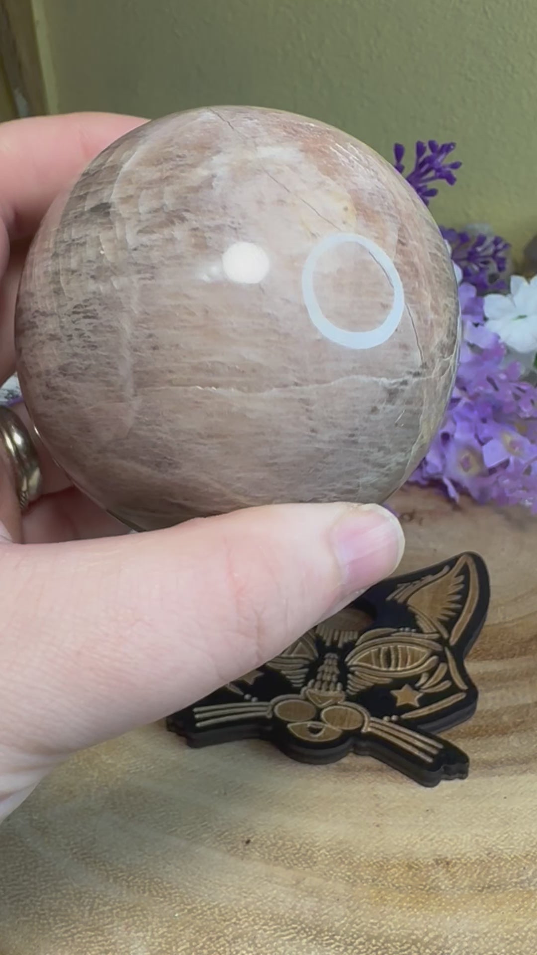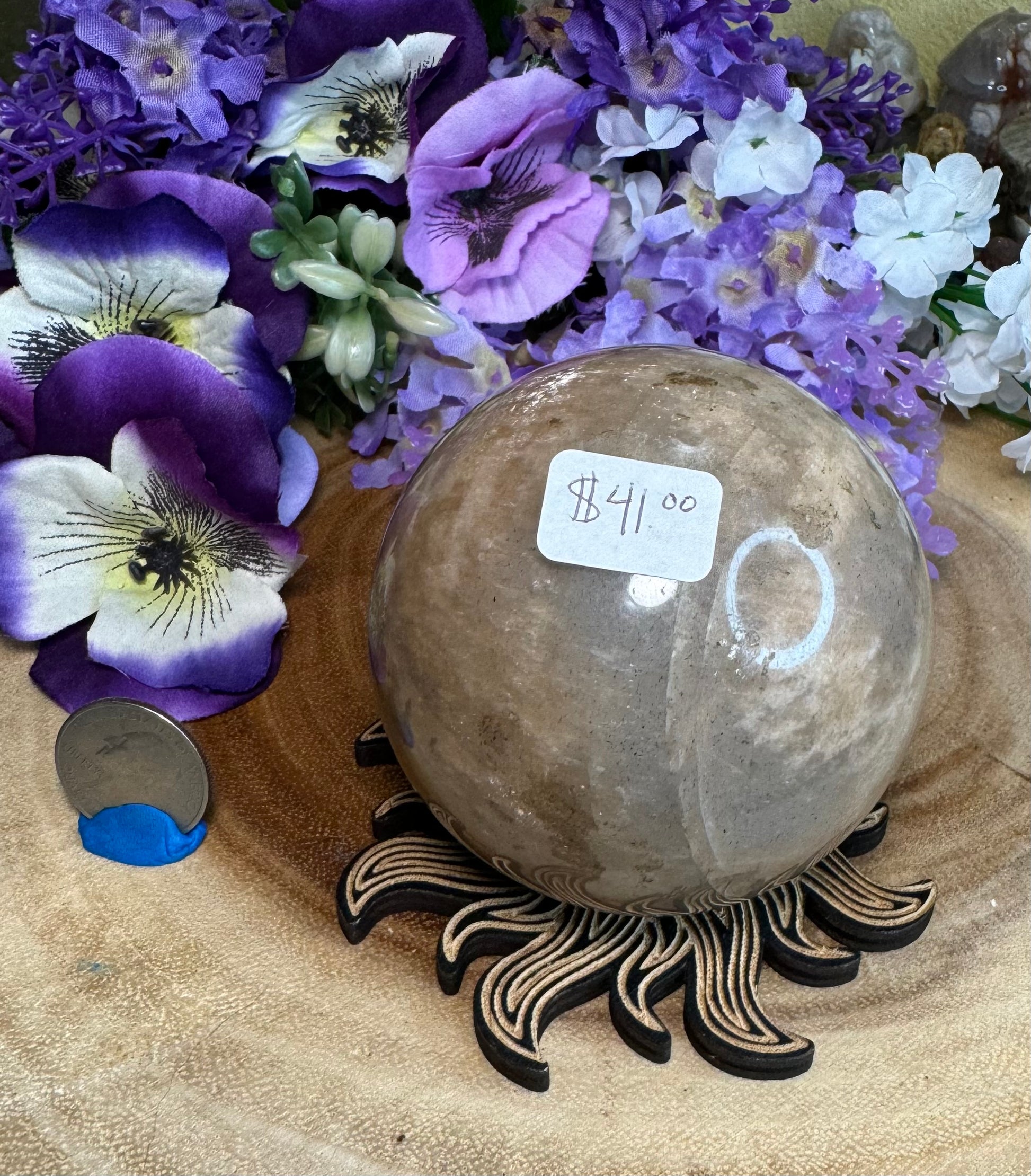 Please select the sphere you would like, to help tell them apart I put sphere #1 on a wooden cat sphere stand, and sphere #2 is on a wooden sun sphere stand. If you have any questions, feel free to reach out on social media or through the chat feature. Sphere #1 is 68mm and sphere #2 is 75mm.