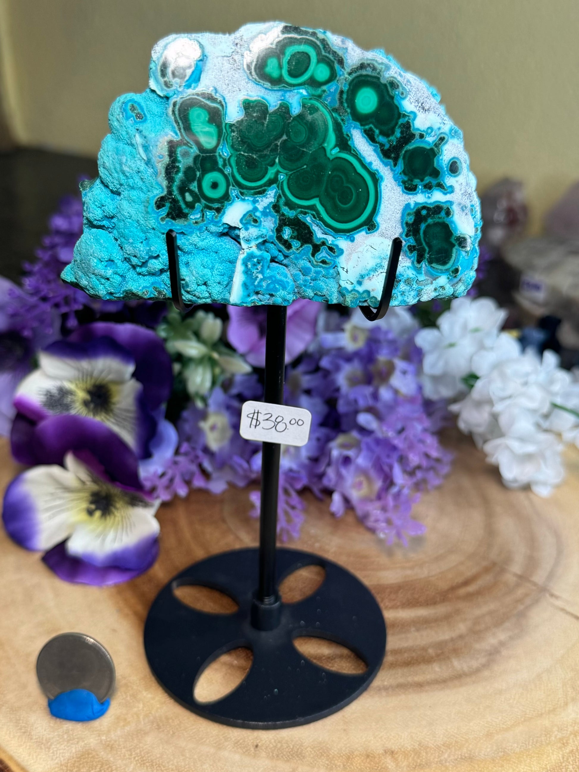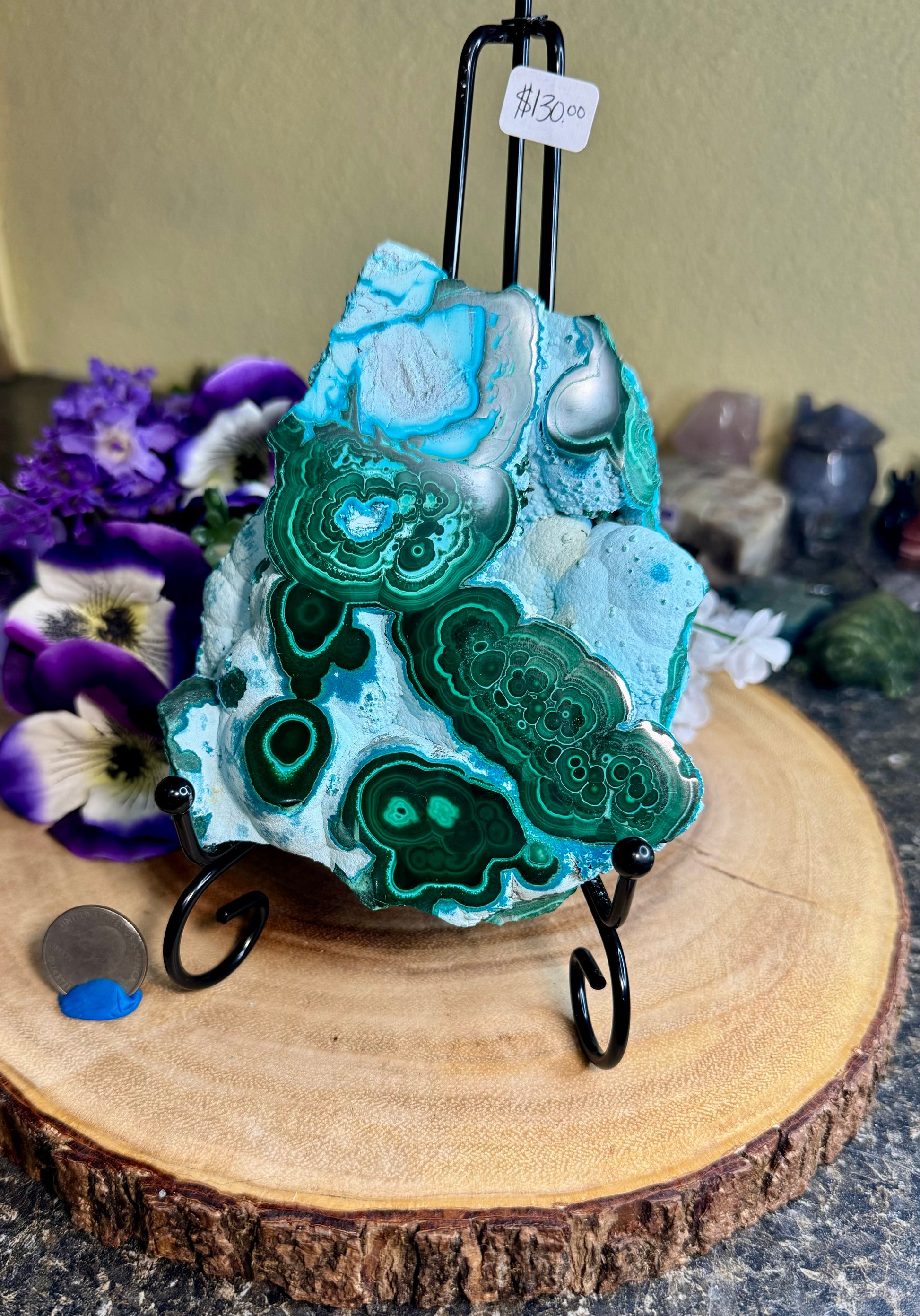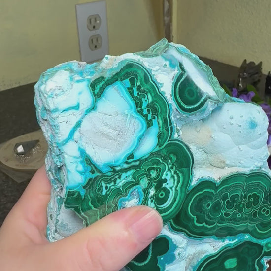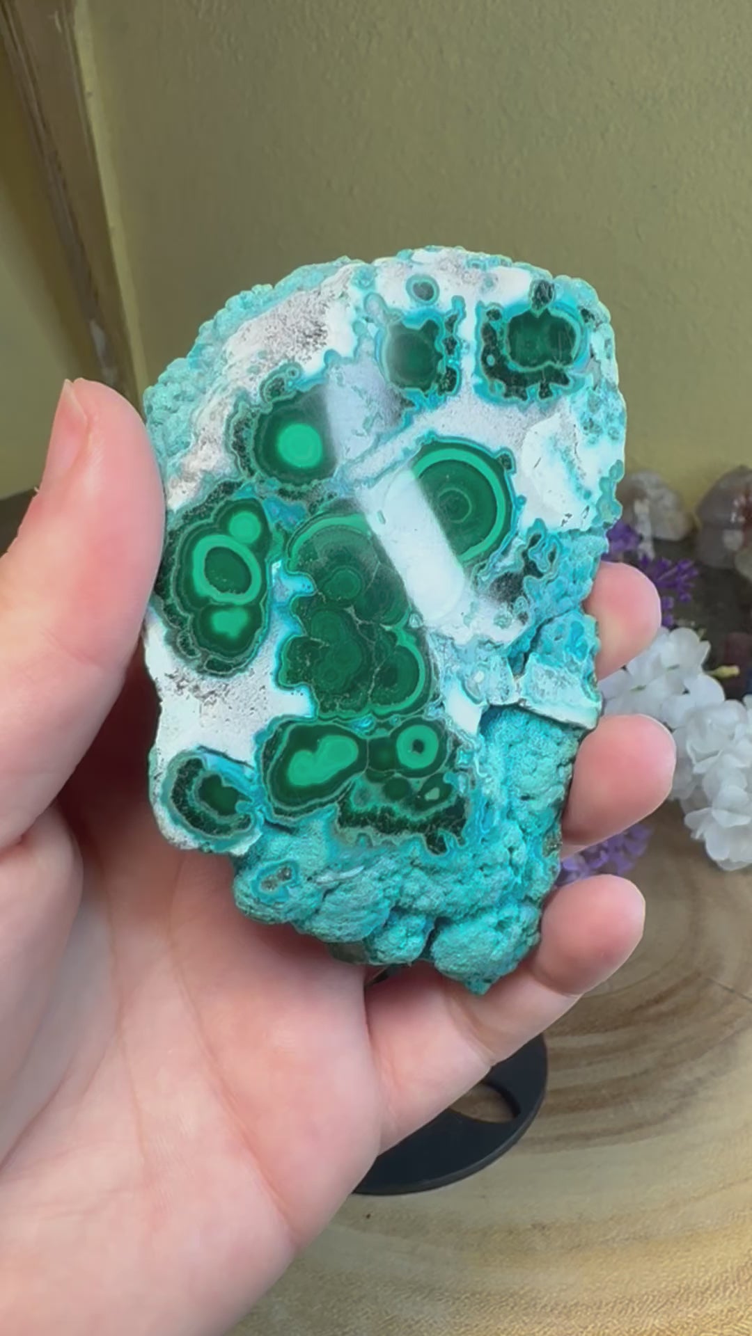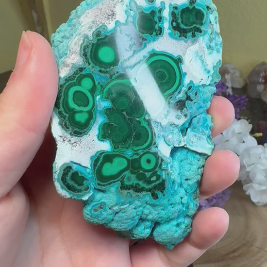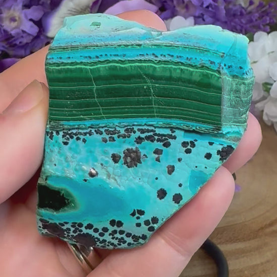 Malacholla is a combination of Malachite and Chrysocolla. It carries both the rich green of malachite and the bold turquoise hues of chrysocolla.