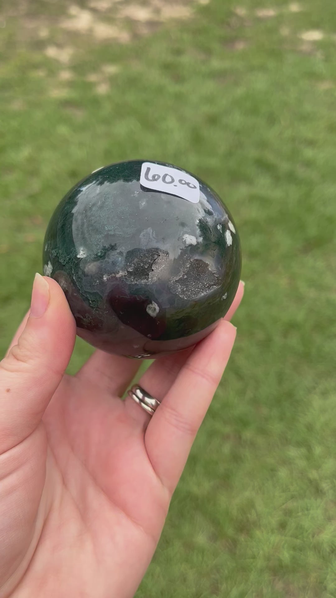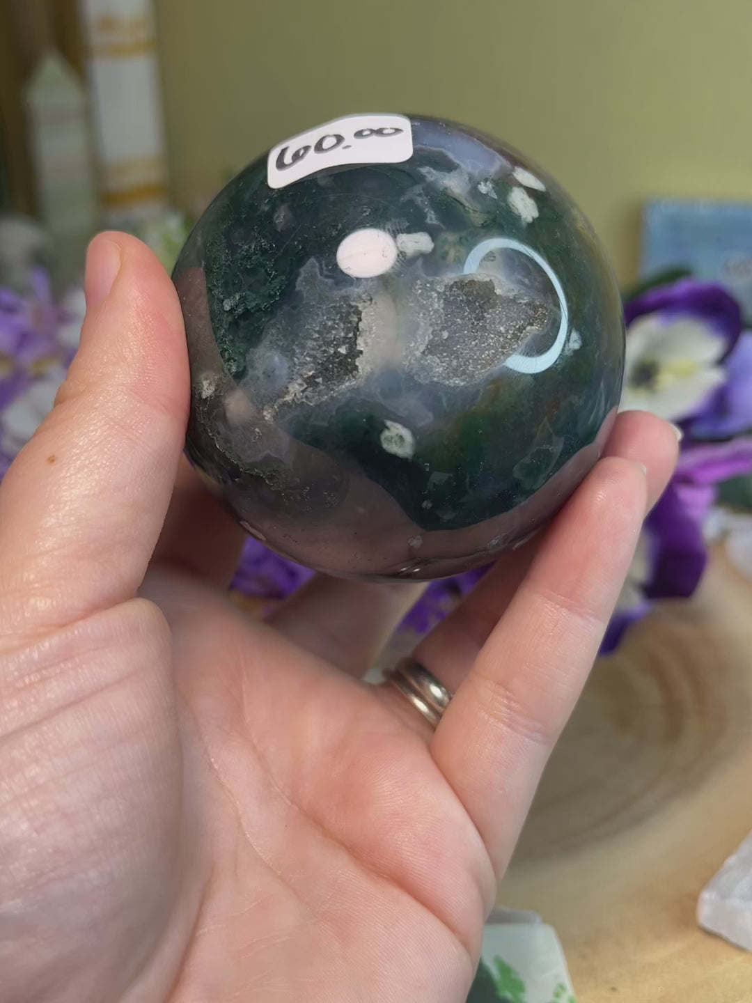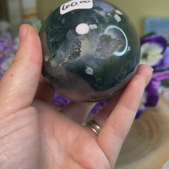 This sphere is approximately 68 mm or 2.7 inches wide. Moss agate is said to encourage tranquility and emotional balance, and is a perfect stone for those that are dealing with a deep seated emotional pain. Moss agate helps heal your heart while working to release the anger that normally comes along with being heartbroken or betrayed. Though that is just one of the many beneficial healing properties Moss Agate holds.