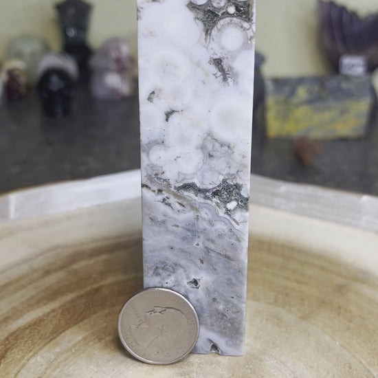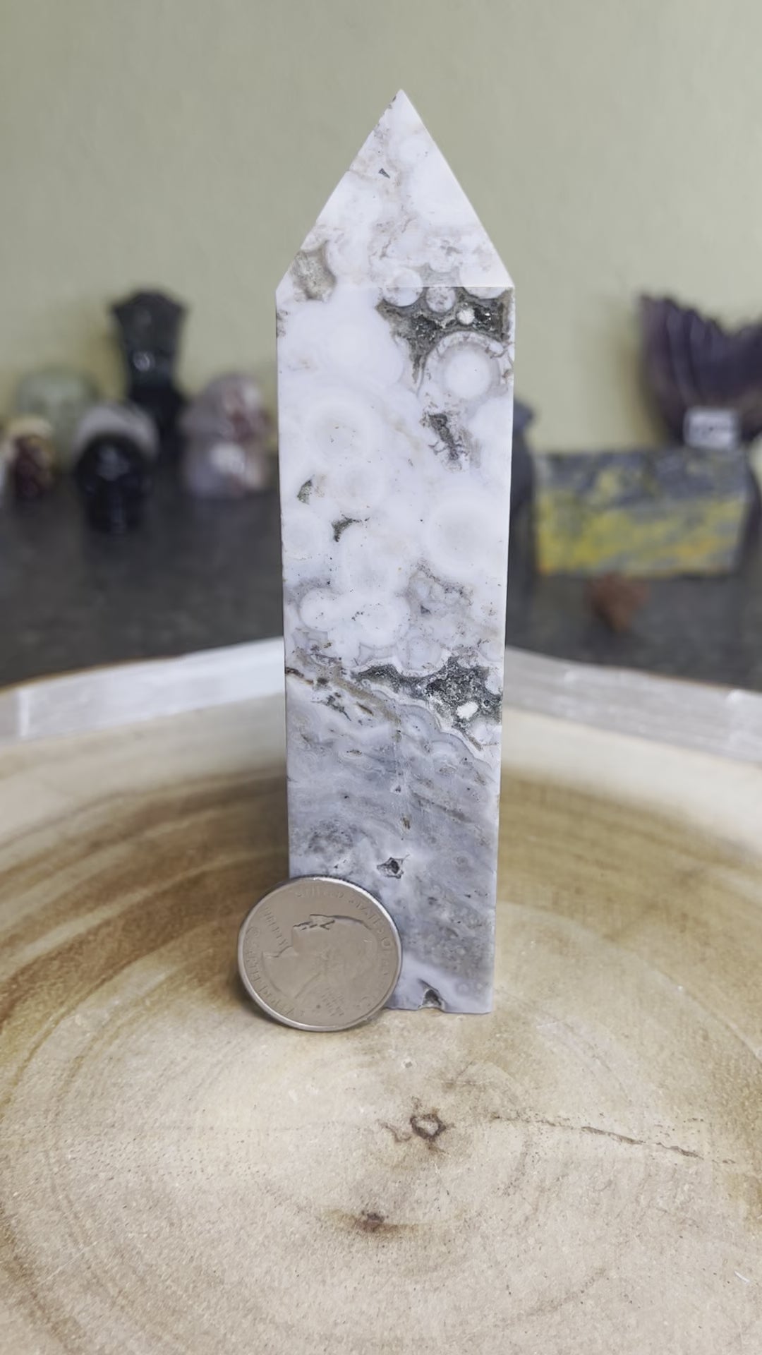 This gorgeous ocean jasper tower has green druzy and stands approximately 5” tall by 1” wide.