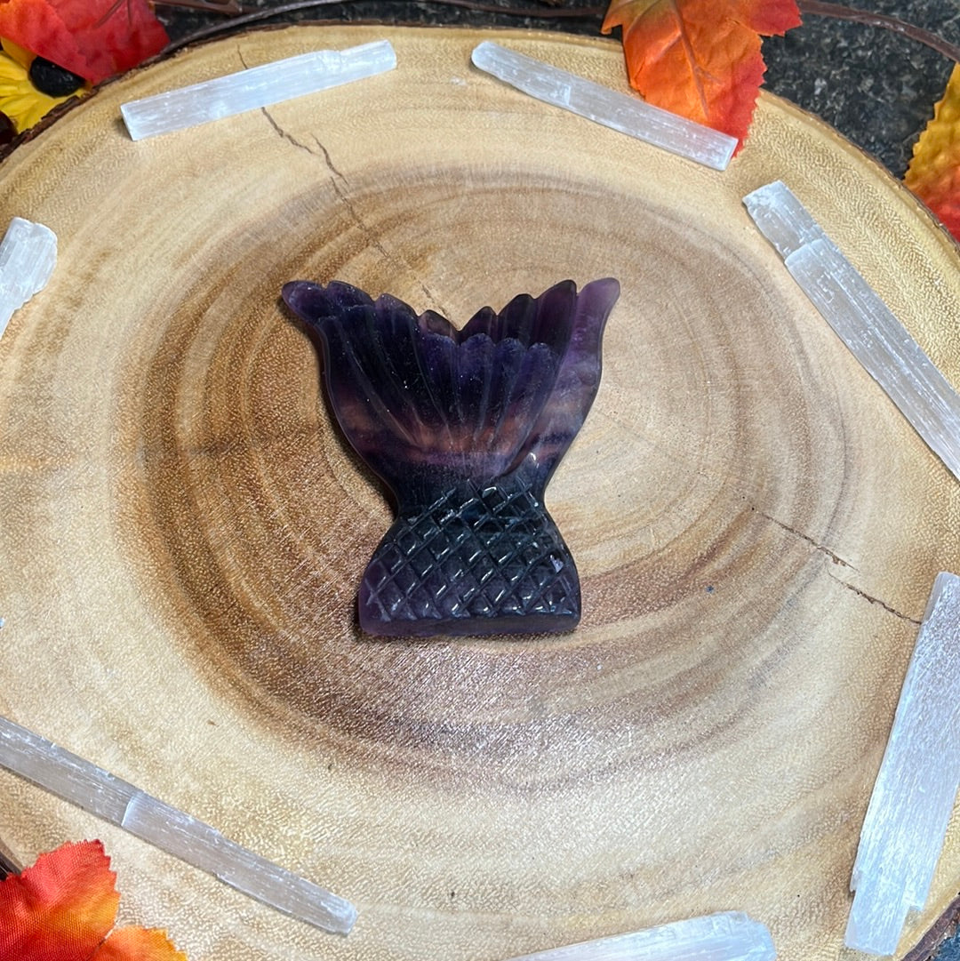 This Rainbow Fluorite mermaid tail carving measures approximately 3.5” tall by 3” wide.