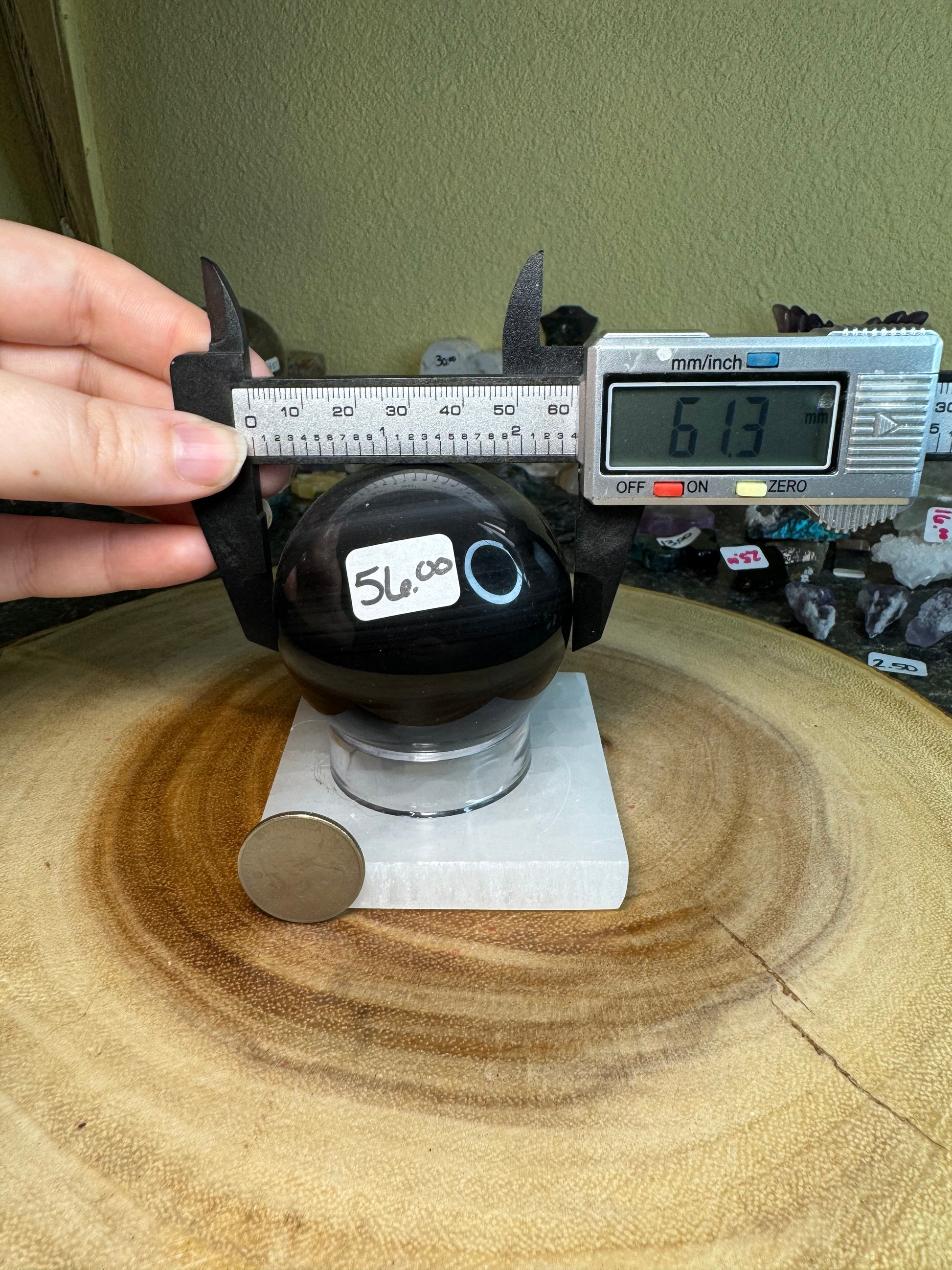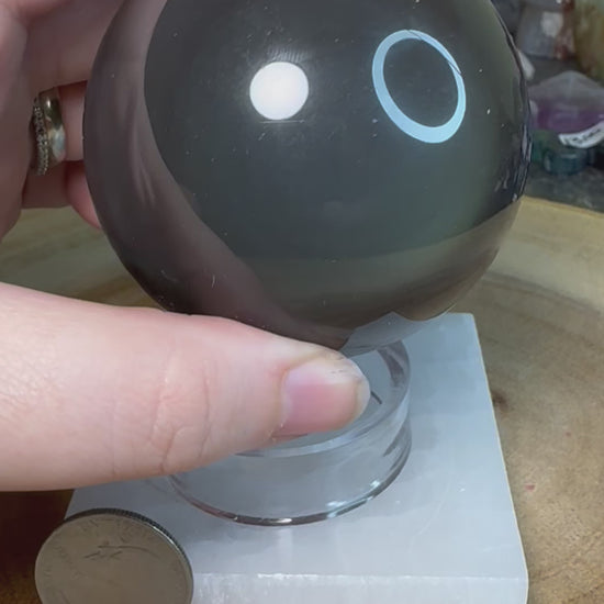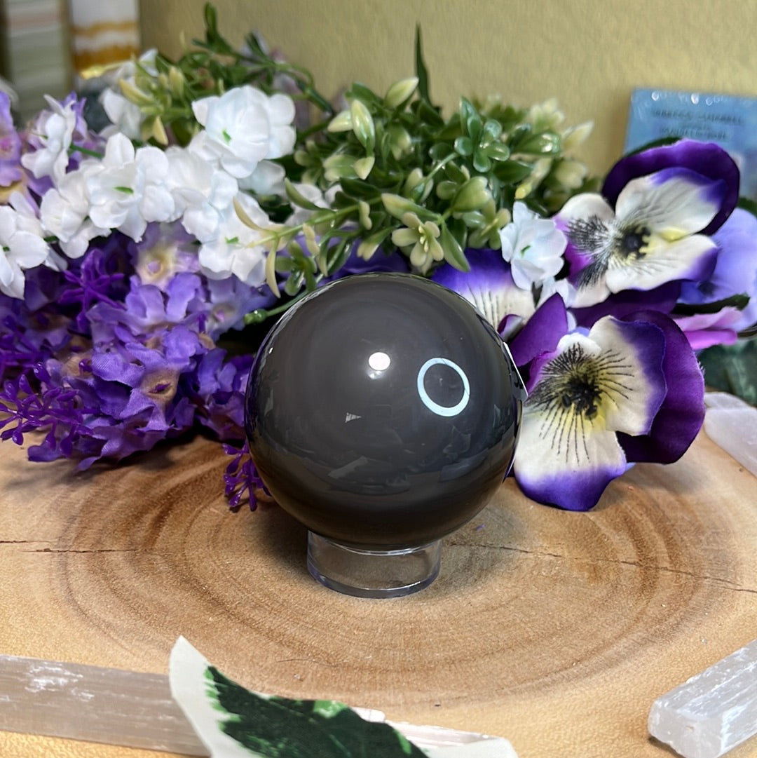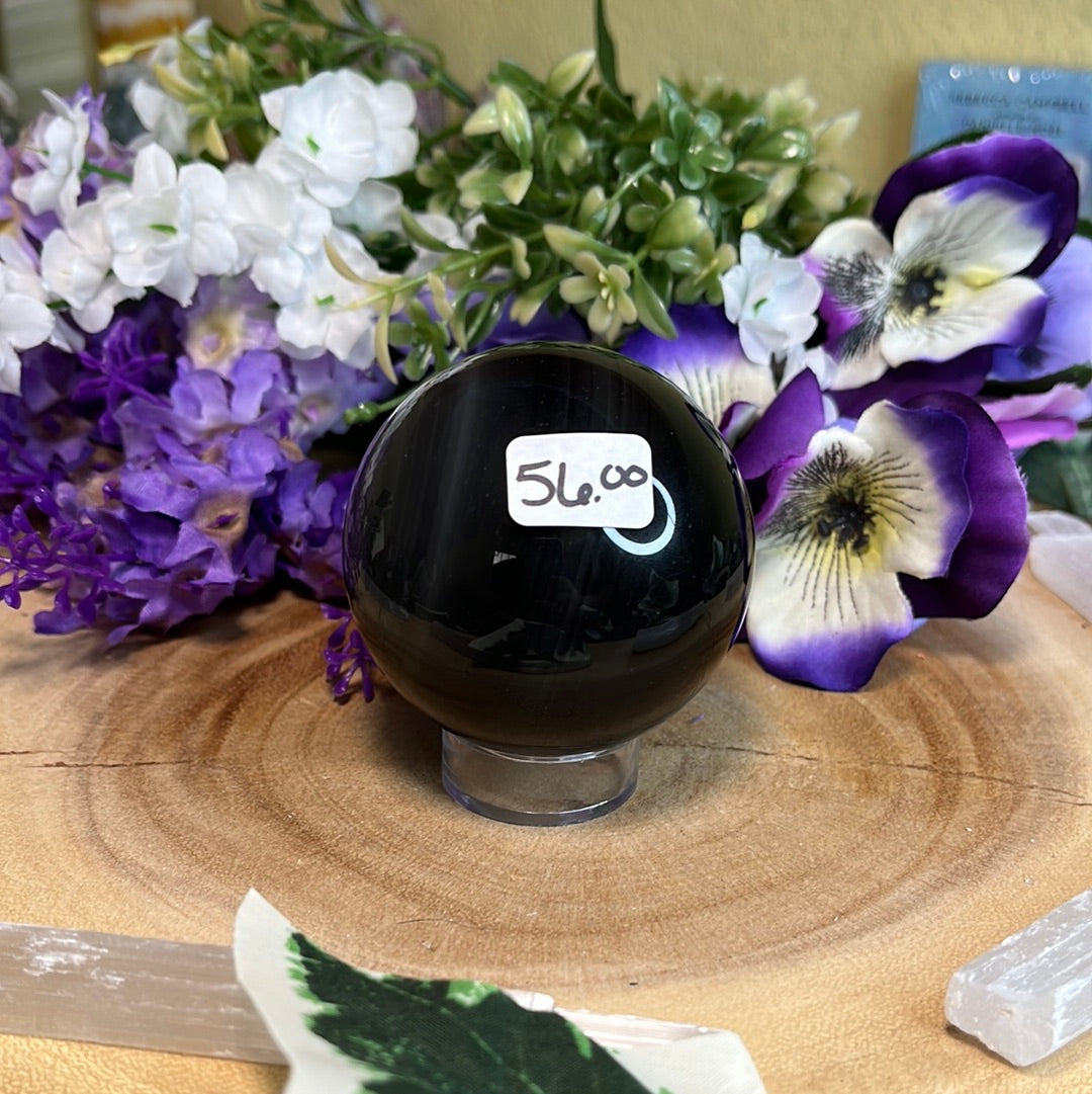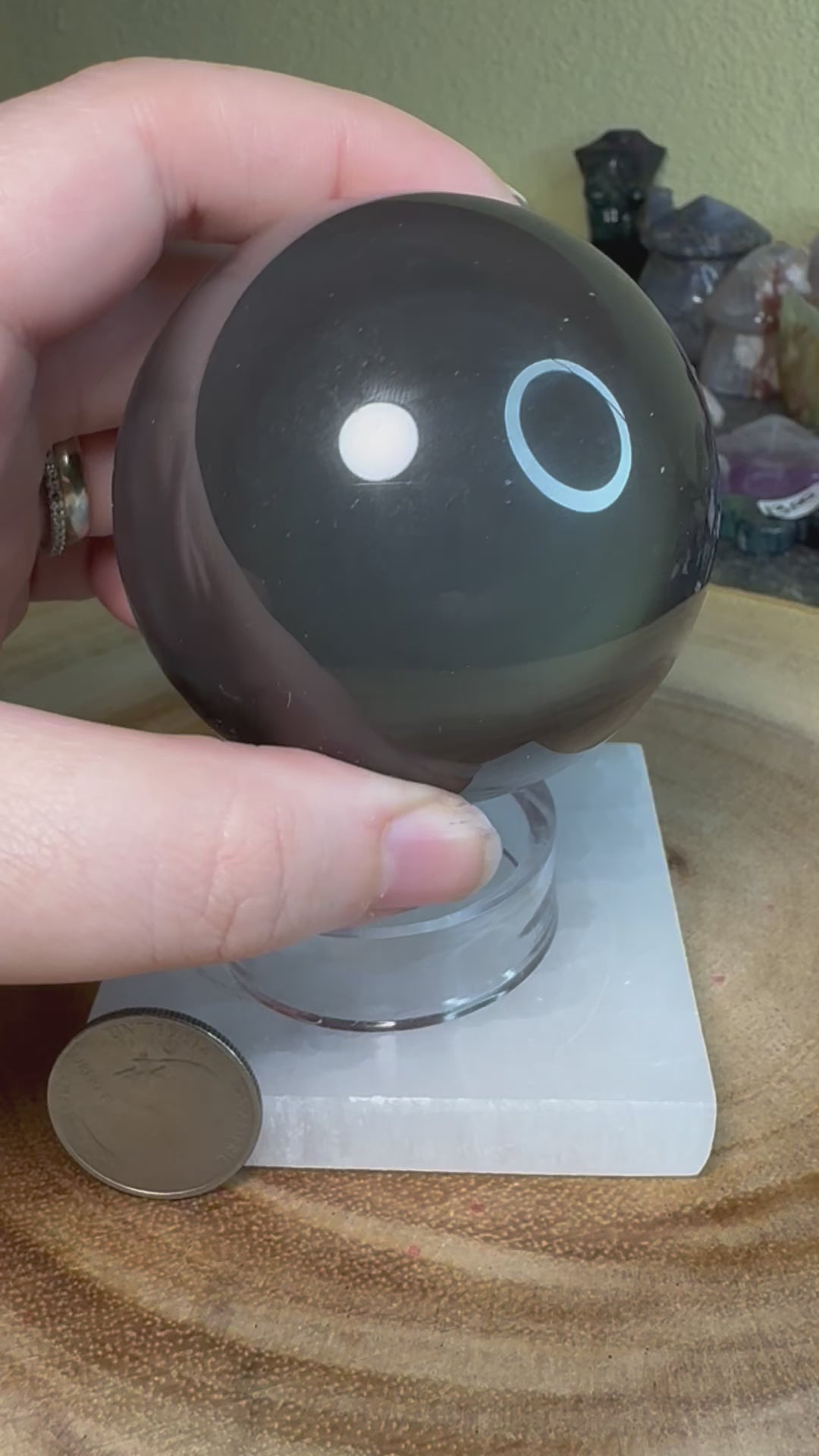 Obsidian is a stone formed by lava that didn’t have enough time to cool into glass. This volcanic glass aids in protection, grounding, and spiritual communication. This sphere is approximately 61 mm or 2.41 inches wide.