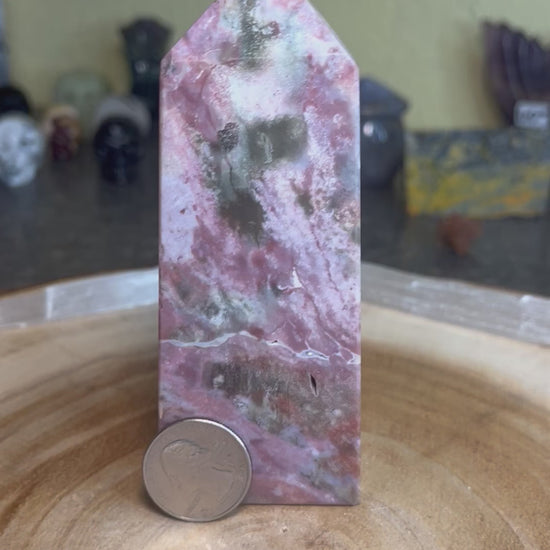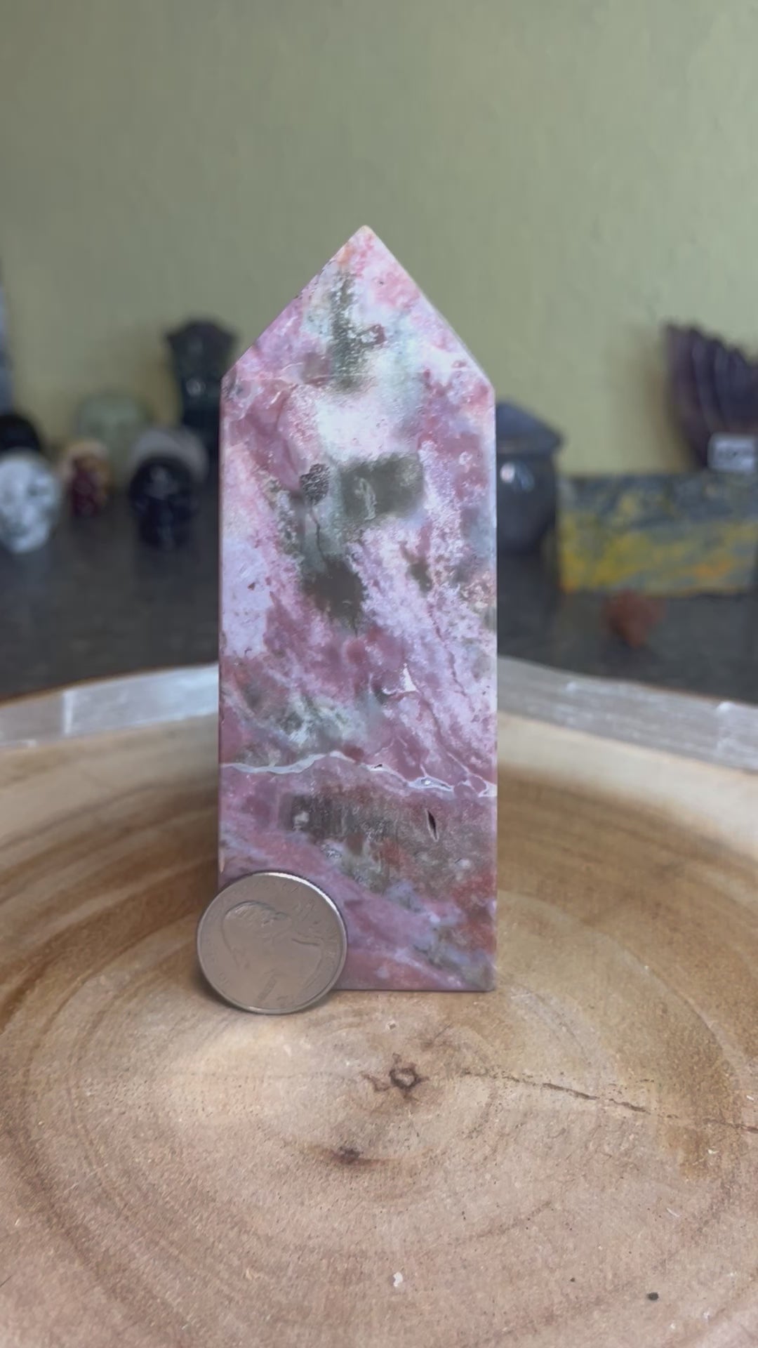 This gorgeous statement tower boasts shades of pinks, greens, and greyish blue.