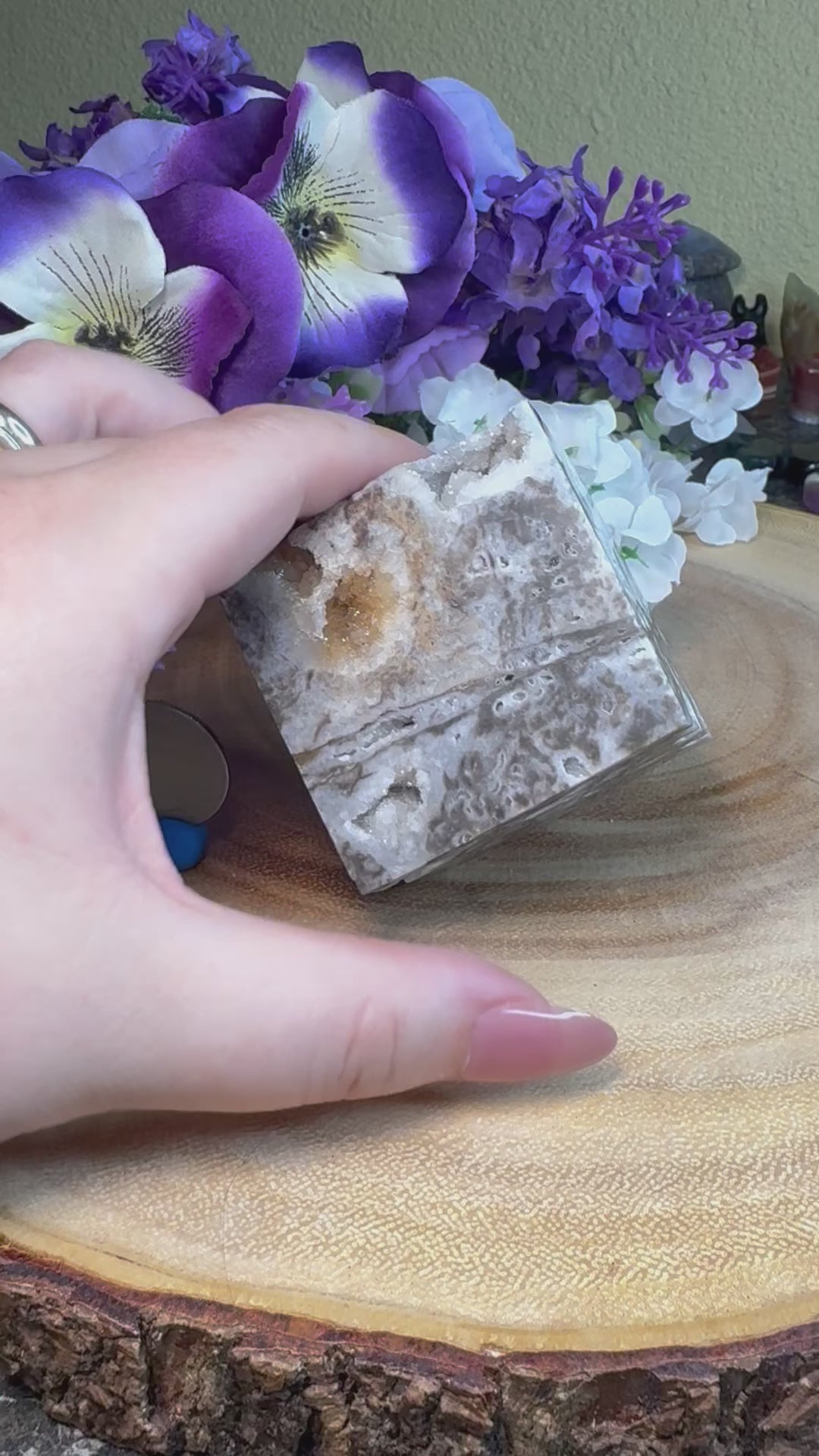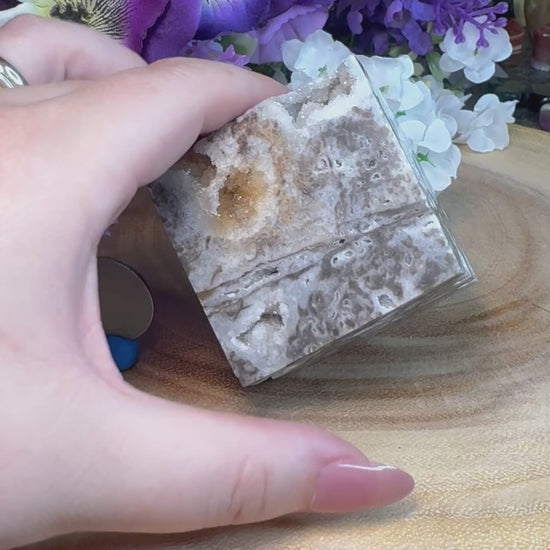 Sphalerite in its true form is a metallic mineral made of zinc sulfide, and it is not this druzy sparkly crystal we have come to associate with Sphalerite. These crystals have been given the name Sphalerite as a blanket term or a trade name because its often found in the same location or a close location as Sphalerite. Because of this, they do sometimes have Sphalerite inclusions. However, they are mainly composed of quartz and agate with some form of iron, ore, and zinc inclusions. The inclusions is what give them their brown, grey, and black coloration.